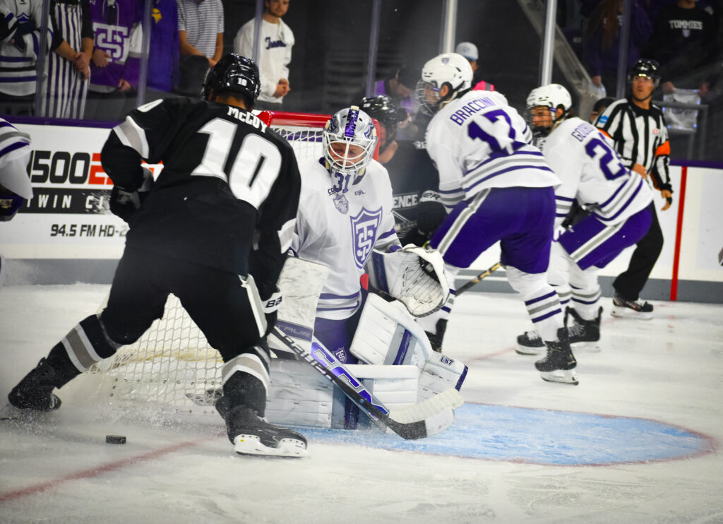 With UST on the penalty kill, Tommies forward Nathan Pilling collected a clearing attempt at center ice, raced into the Friars zone and beat goalie Philip Svedeback blocker side to score the first men’s goal in LPAA history. UST took that 1-0 lead into the second period.
