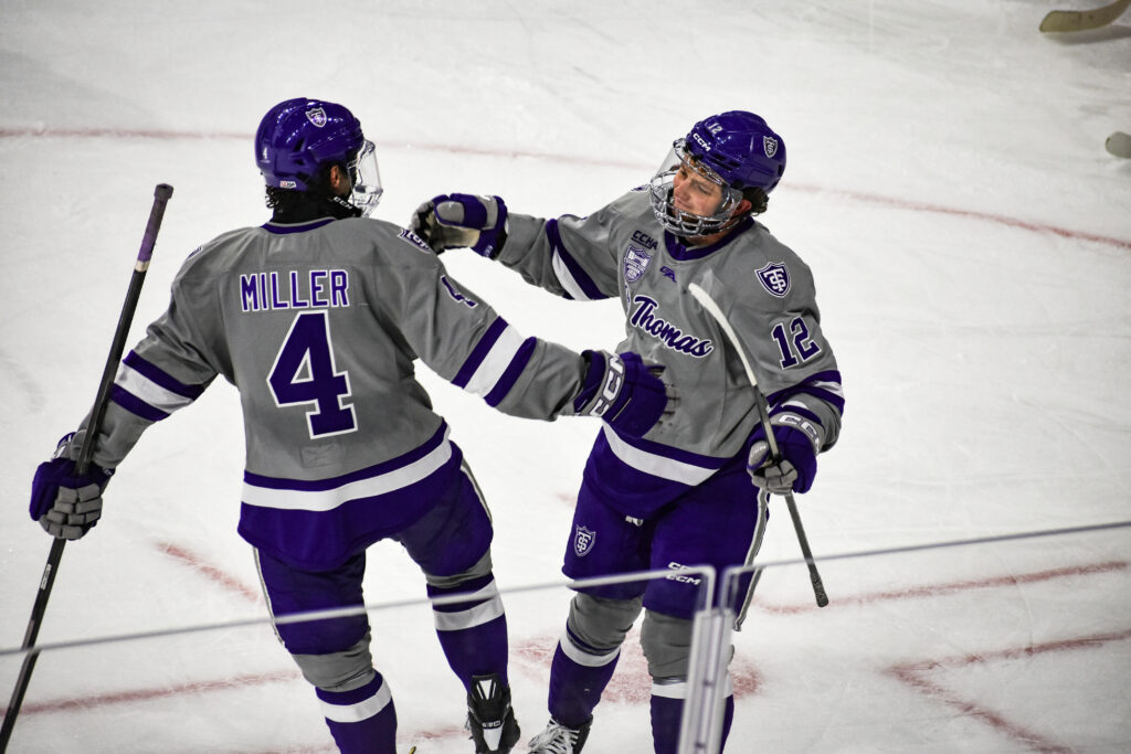 St. Thomas’ Alex Gaffney (right) celebrates his second period goal with teammate Cole Miller during a game against Bowling Green on Nov. 22 in St. Paul. (Photo by Ryan Stieg)