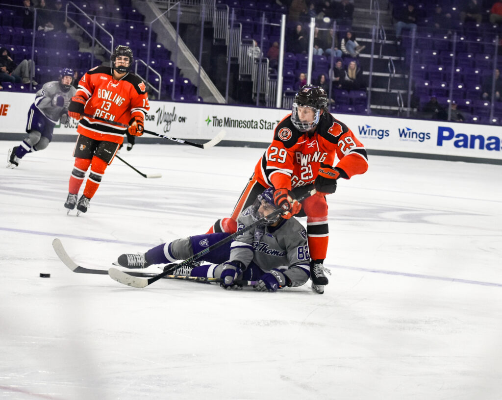 St. Thomas’ Charlie Schoen gets taken down in the Bowling Green defensive zone by the Falcons’ Brody Waters during the first period of a game Nov. 22 in St. Paul. (Photo by Ryan Stieg)