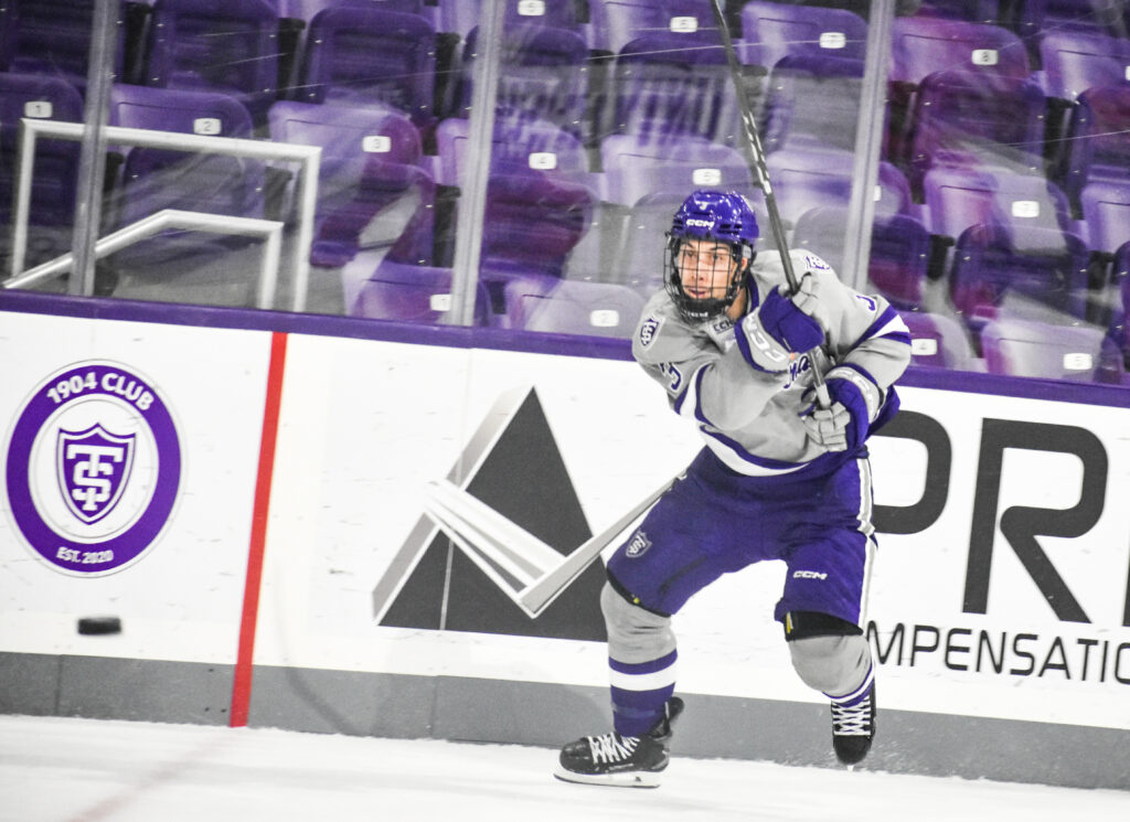The third period was almost all Tommies. UST padded its lead to 3-1 on a goal by Hayes Hundley at 2:46. Hundley sent a shot from the point through traffic that somehow snuck under Steinman’s pad and slid into the net.