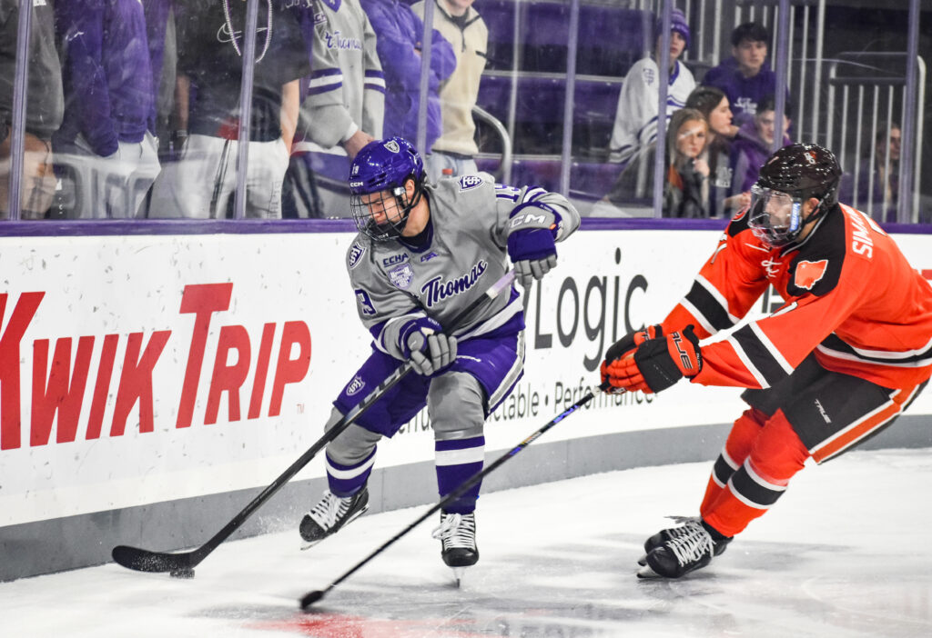 The Tommies didn’t exactly get the start they were hoping for, but they had a great finish as UST scored four goals in the third period to defeat the Falcons 6-2 and get its first CCHA regulation win of the season. Alex Gaffney scored two goals for the Tommies and Carsen Musser made 39 saves to get his first victory in net since the season opener against St. Cloud State.