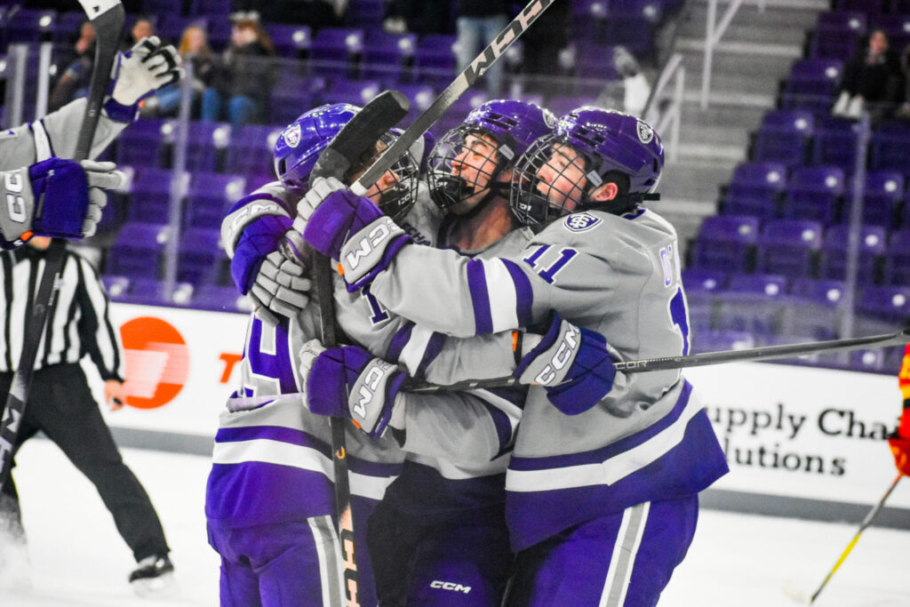 St. Thomas’ Luc Laylin (left) celebrates with his teammates after his game-tying goal during the third period of a game against Ferris State on Jan. 2 in St. Paul. (Photo by Ryan Stieg)
